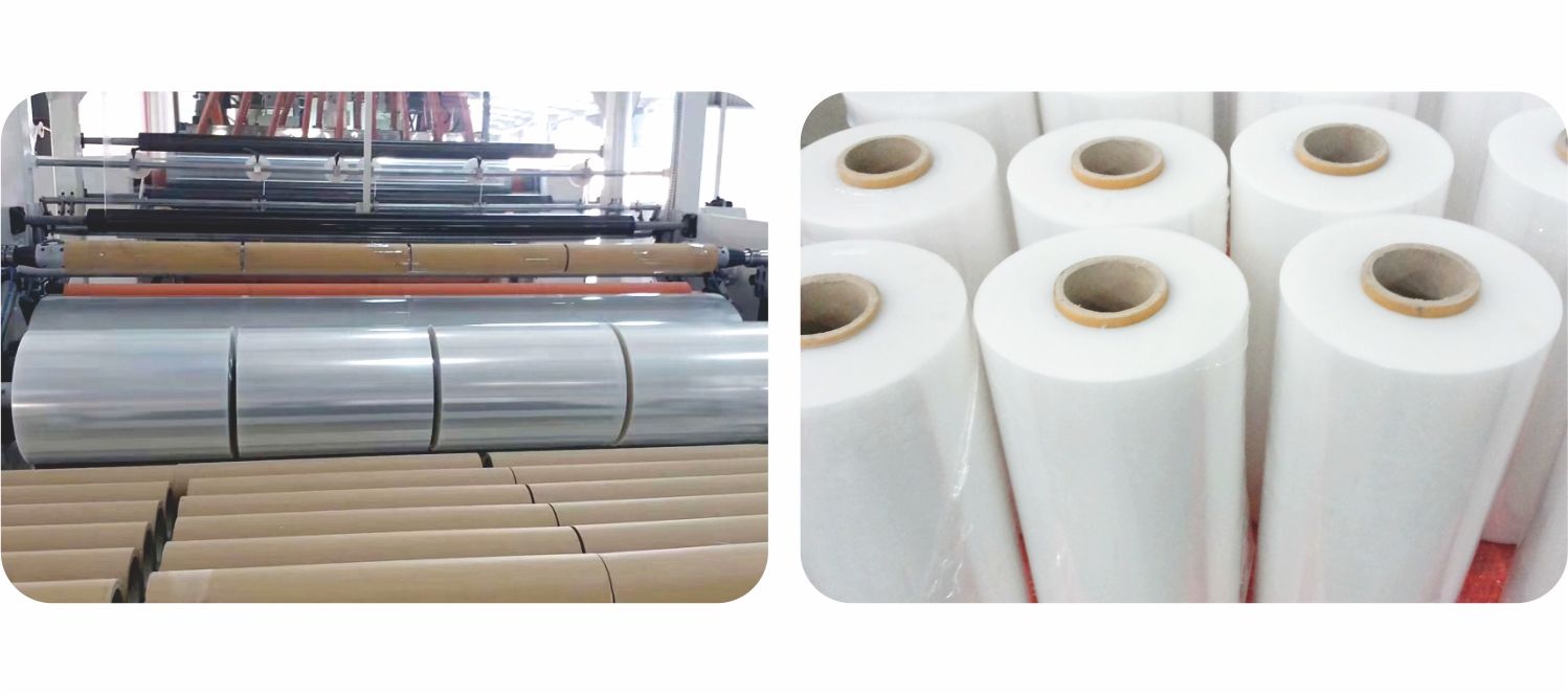 本生產線以LLDPE為主要原料,采用幾種不同牌號的樹脂,通過擠出機擠出而生產出具有自粘性的單面粘或者雙面粘三層或五層拉伸纏繞膜。該機組采用先進的智能工業控制系統,配合隱蔽式自動切刀、自動裝卸紙管裝置,確保操作既安全又方便,收卷更加結實、平整,保證了產品的質量。大大提高了生產效率,降低了生產成本,創造更大的價值。副機加裝搖擺裝置可以提高卷材的平整度及外觀質量,使產品具有更強的競爭力。